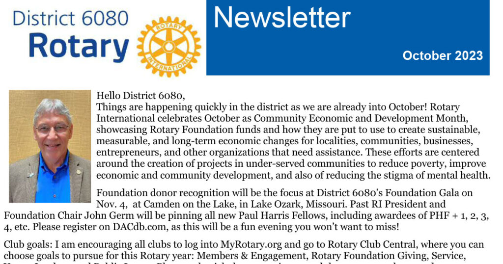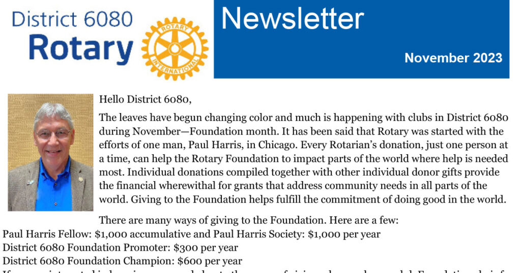 The leaves have begun changing color and much is happening with clubs in District 6080 during November—Foundation month. It has been said that Rotary was started with the efforts of one man, Paul Harris, in Chicago. Every Rotarian’s donation, just one person at a time, can help the Rotary Foundation to impact parts of the world where help is needed