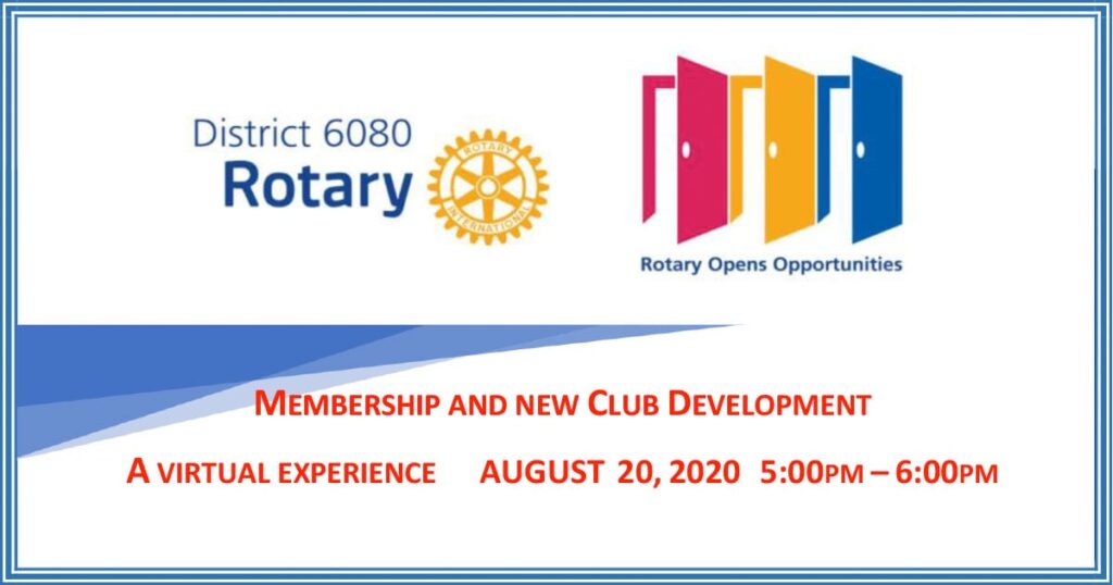 August 20, 2020 | 5pm-6pm Join District Governor Jacque Howard and the 6080 Membership Team in this interactive and engaging experience. We’ve got new challenges and new opportunities to #GrowRotary so you don’t want to miss it! REGISTER HERE