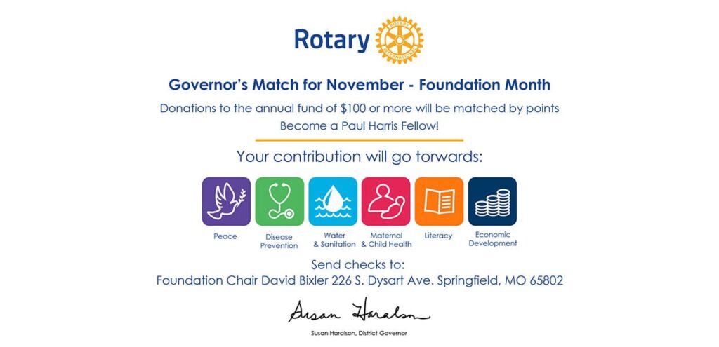The Rotary Club of Springfield is so proud of our member and District 6080 Governor-elect Paul Reinert & Carol Reinert for their contributions to the Rotary Foundation. Their generosity has led them to achieve Major Donor status, level 2. Thank you for making a difference through the Rotary Foundation and your leadership!